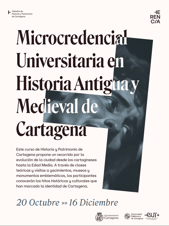 La Cátedra de Historia y Patrimonio de Cartagena HERENC/A impulsa la Microcredencial en Historia Antigua y Medieval de Cartagena, un programa formativo centrado en el conocimiento histórico y patrimonial de la ciudad desde la Antigüedad hasta la Baja Edad Media. A lo largo de diversas sesiones, el curso aborda temas como los cartagineses en Cartagena, la ciudad romana y su teatro y anfiteatro, la Antigüedad tardía, la Cartagena musulmana y la Cartagena castellana, combinando la docencia con visitas a yacimientos y museos de la ciudad.